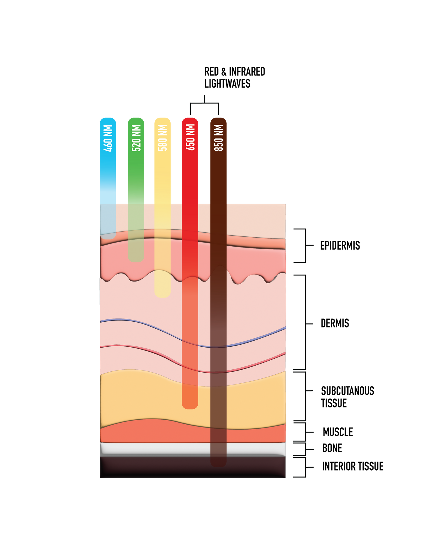 Red and infrared (IR) light penetrates deeper into the human body. It can reach cells, tissues, blood, nerves, bone marrow, even into the brain.